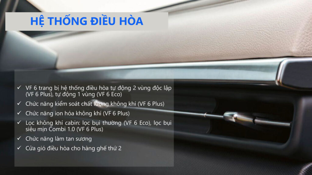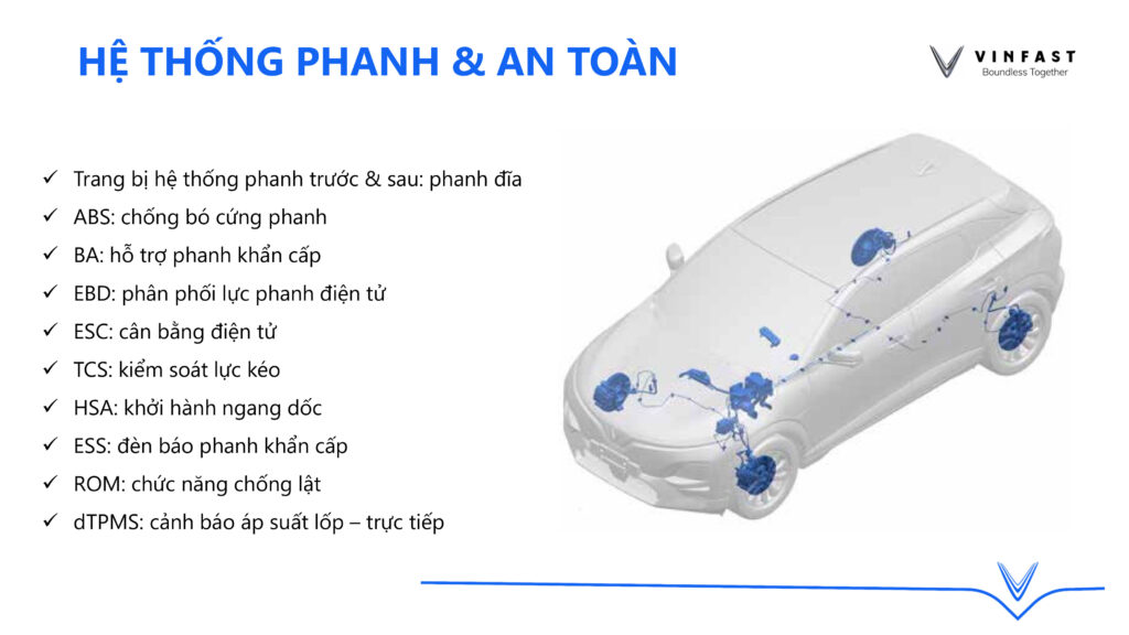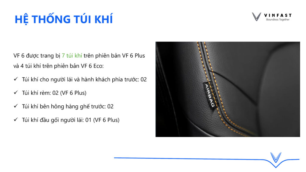 An toàn là ưu tiên hàng đầu trên các dòng xe VinFast. VinFast VF6 được trang bị hệ thống túi khí đầy đủ (4 túi khí bản Eco, 7 túi khí bản Plus) cùng hệ thống khung gầm chắc chắn.