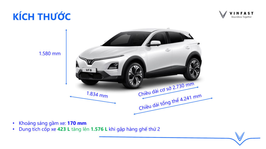 Kích thước tổng thể của xe lần lượt là 4.241 x 1.834 x 1.580 mm (Dài x Rộng x Cao). Đáng chú ý, chiều dài cơ sở lên tới 2.730 mm giúp VF 6 sở hữu khoang nội thất rộng rãi hàng đầu phân khúc. Khoảng sáng gầm xe 170mm cùng bộ mâm lớn (17 inch bản Eco và 18 inch bản Plus) giúp xe di chuyển linh hoạt trên nhiều địa hình.